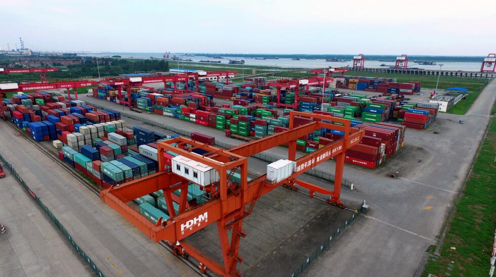 繁忙的岳阳城陵矶港国际集装箱码头一角。