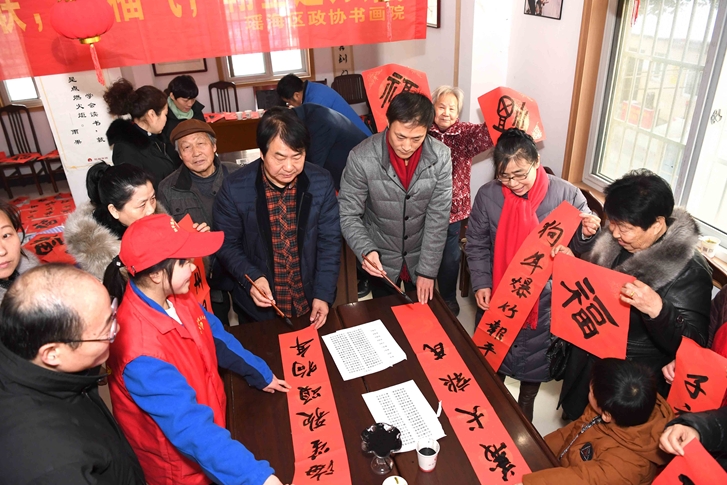 【香港商报网讯】2月2日,在合肥市瑶海区和平路街道茂林路社区,书法家们在为社区居民写春联送祝福。当日,合肥市瑶海区政协书画院组织书法家走进和平路街道茂林路社区开展“写春联 送祝福 迎新春”活动。活动中,书法家们为社区居民书现场写春联和“福”字,为居民送上文化祝福,迎接新春。(通讯员解琛)