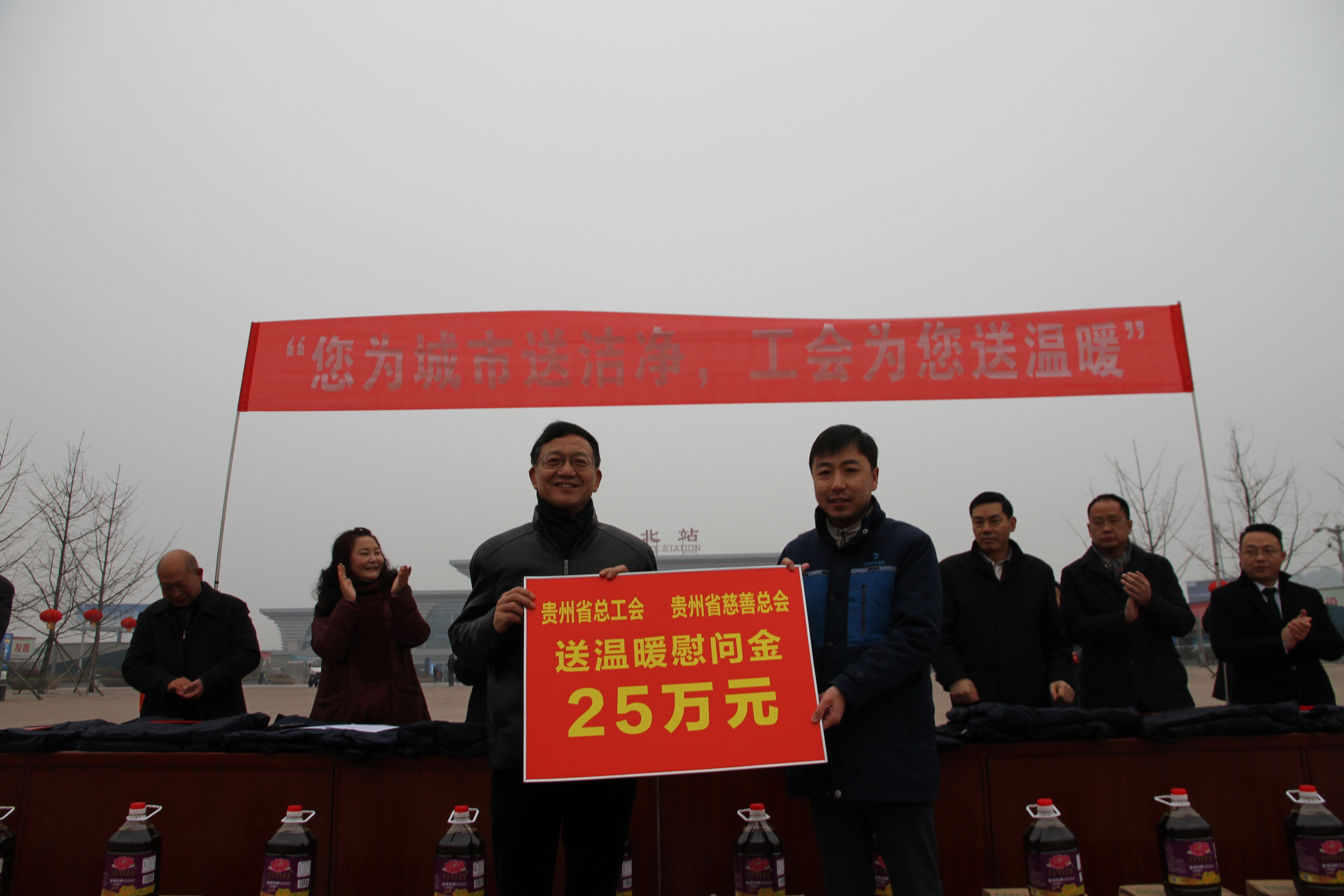 【香港商报网讯】记者 黄庆松 报道:2月7日上午,由贵州省总工会、省慈善总会联合开展“您为城市送洁净.工会为您送温暖”“善行贵州守望相助”慰问活动在贵阳北站西广场上举行。据悉,当天为300名环卫工人代表送去了“暖心礼包”,以及节日的祝福。