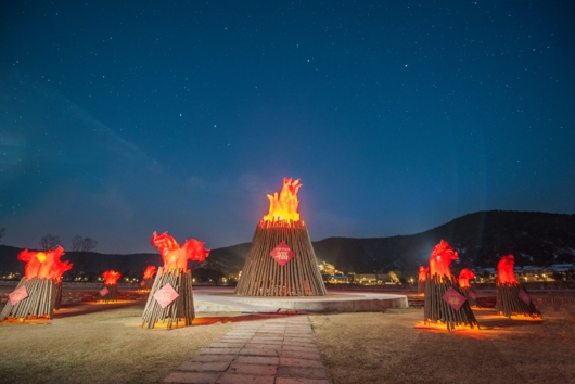 红色为中国人新年的主色调,红红火火寓意新的一年有声有色、添福添财。春节期间,拈花湾农禅广场设置15米高的巨型篝火,以安全可控的光电形式打造电子篝火,昼夜红火。篝火通电后散发柔美祥和的霓虹光彩,如火焰般熊熊燃烧,寓意红火旺春,激情点燃新春祝福。