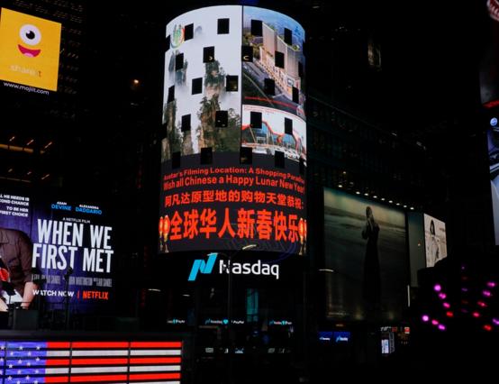 【香港商报网讯】]记者张思静、通讯员王建军报道:纽约当地时间2月15日,美国纽约时代广场的纳斯达克大屏幕,滚动播出中英文祝福的宣传片:“阿凡达原型地的购物天堂恭祝全球华人新春快乐!”宣传片上展示了中国著名风景区张家界的独特峰林,以及将在今年建成运营的张家界丰泽国际公共保税仓、东方曼哈顿全球保税直购中心。