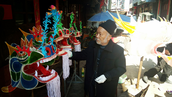 王安林正在给扎好的龙头上色