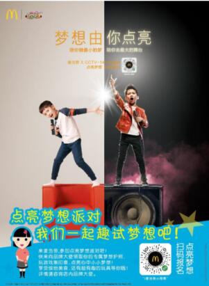 麦当劳首次携手CCTV14-少儿频道,为中国儿童打造全国性舞台,让他们表现才华、展现梦想。2018年3月1日到6月30日,顾客可以通过微信小程序“i麦当劳”相关页面报名并上传视频;经过公众投票和专业评审后,孩子将受邀前往全国15个城市参加选拔,各地最后将选出四名孩子(即全国共60名),参加今年暑期在北京进行的“点亮梦想”节目录制。节目组将邀请知名专业嘉宾(如央视导演、著名主持人月亮姐姐等),为孩子们提供专业的指导和点评。节目预计于2018年9月播出。