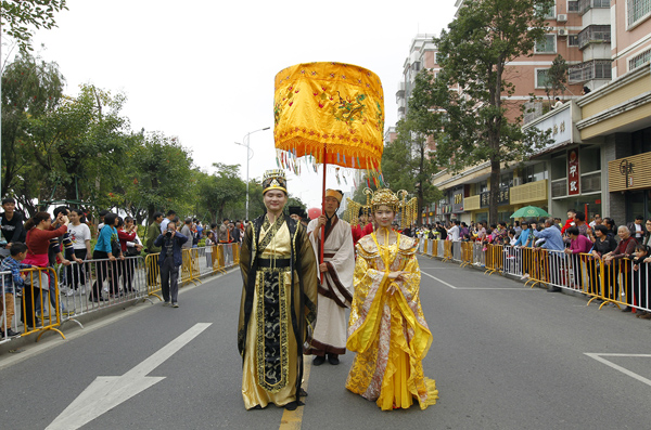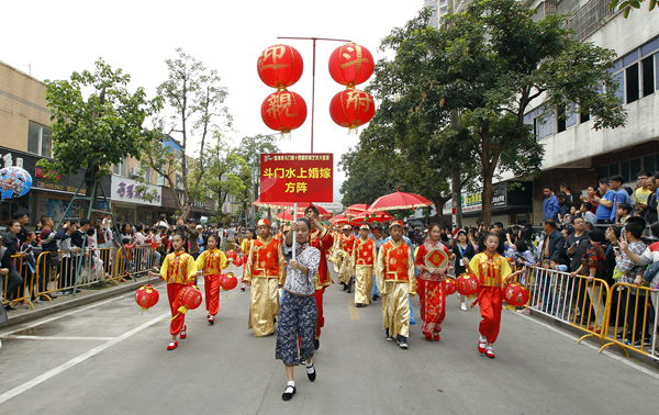 喜庆欢乐、本土气息浓郁的斗门水上婚嫁方阵由白蕉镇表演。“斗门水上婚嫁”习俗是国家级非遗名录。该方阵由新郎、新娘、大妗姐、伴郎、伴娘、船家、婚童等构成,演员达160多人。表演形式:由20条旱船组成,每一条船都按水上婚嫁花船设计。船上站新娘,大妗姐撑红伞,伴郎手提鸡鸭,伴娘手提礼品篮,船家手提椰子,船边新郎、婚童手拿小灯笼和鞭炮。现在,花船、新郎、新娘、大衿姐和民歌手正在花船上表演祭龙王、拜高堂等场景,船下有20名闹婚的小孩子。