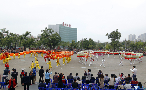首先亮相的是阵容鼎盛的龙队方阵,群龙共舞,气势恢宏,表演在整个龙队方阵中,由金、银龙担任点睛任务,三种不同类型的龙互相穿插,真可谓龙腾霞蔚,气势如虹。其中,莲洲舞火龙是广东省级非物质文化遗产“七月三十装路香”中的一项习俗,迄今流传了260多年历史。醉龙舞是古代中山民间特有的舞蹈,源起宋代,盛于明清,流传于中山长洲、张溪、沙溪、大涌、濠头等地,并传至澳门,迄今已流传了700多年。2008年6月,醉龙舞被国务院公布为国家级非物质文化遗产名录。先后参加了上海世博会、广州亚运会、香港中山文化节、广东国际旅游节等。