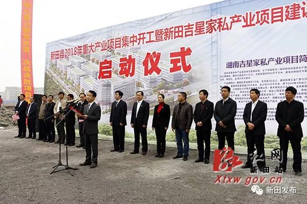 【香港商报网讯】记者唐勇平报道: 3月2日,湖南新田县举行2018年重大产业项目集中开工启动仪式,吉星家私等一批重大产业项目同日集中开工,总投资达88亿元。市委常委、宣传部长刘尤碧宣布项目开工。县委副书记、县长秦山成作热情洋溢的讲话,县委常委、常务副县长王名扬主持开工仪式。