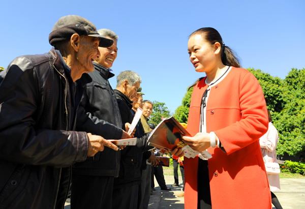 灵山县宣传部长黄春柳为基层群众发放报刊