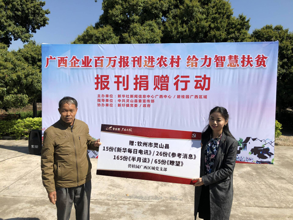 【香港商报网讯】记者馨瑶、实习记者蒋芝东报道:3月9日, “广西企业百万报刊进农村 给力智慧扶贫”报刊捐赠仪式在广西钦州市灵山县新圩镇邓家村村委举行。图为灵山县宣传部长黄春柳为基层群众发放报刊。