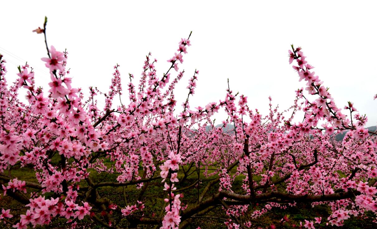 站在山脚下,放眼望去,只见漫山遍野的桃树繁花似锦、姹紫嫣红,粉红色的桃花一朵朵、一枝枝、一簇簇,简直就是粉红色的海洋。