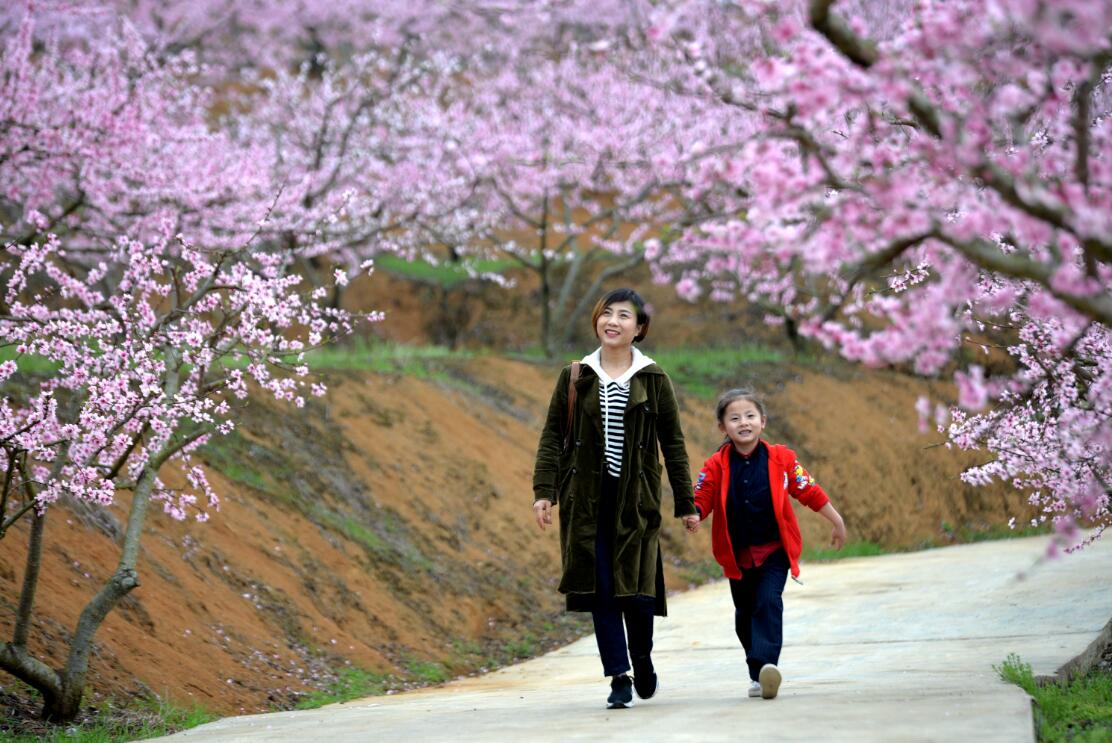 游客步行在盛开的桃花中。