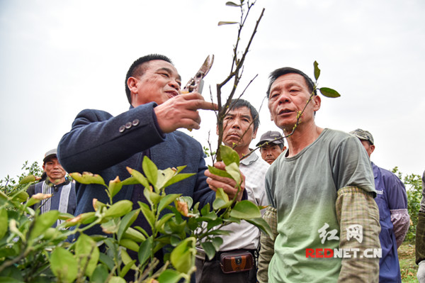 桂阳县农业科技特派员江四清把“讲习所”搬到脐橙基地现场,为果农们讲授病虫害防治技术。