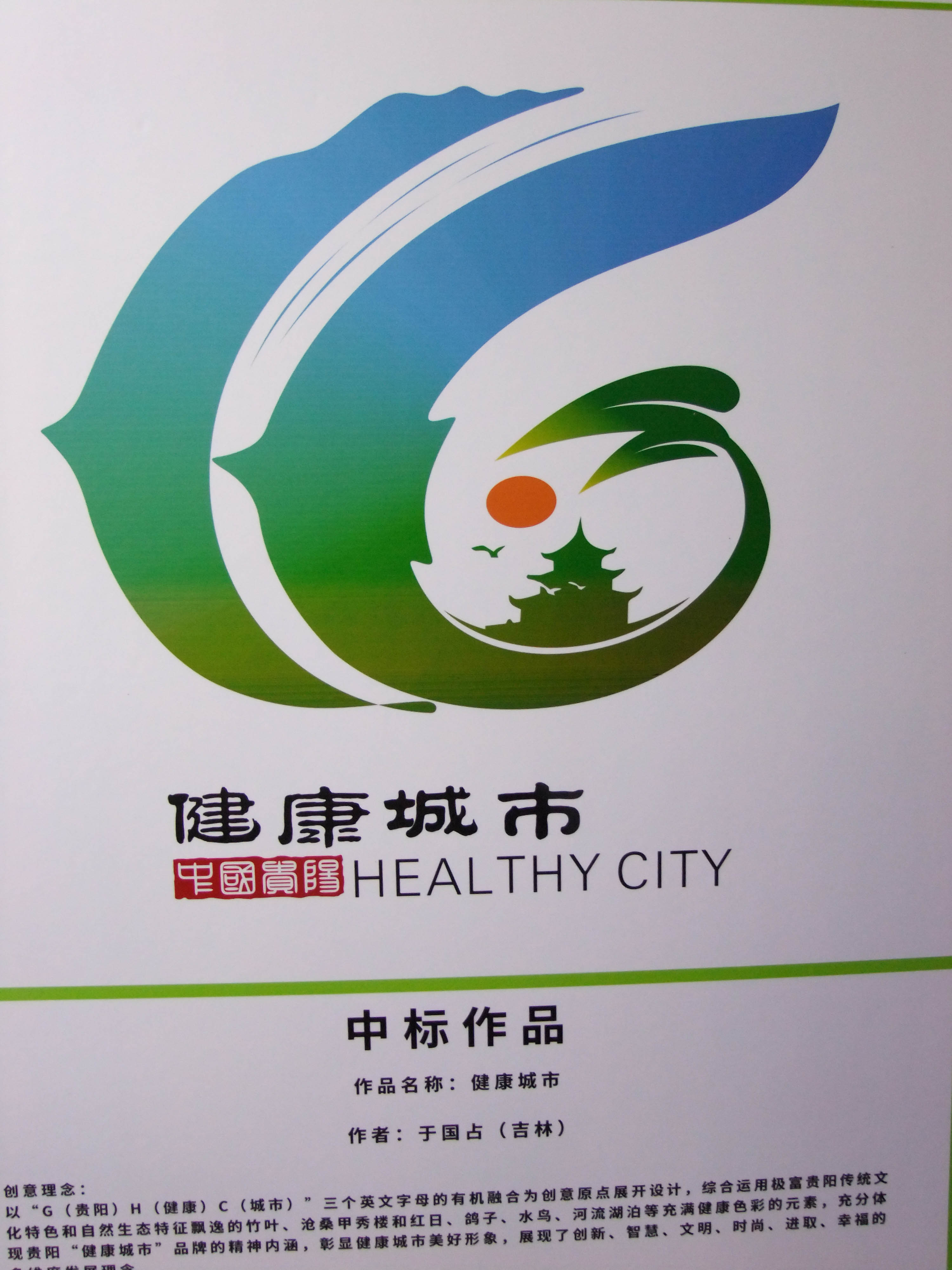 中标方案以“G(贵阳)H(健康)C(城市)”三个英文字母的有机融合为创意原点展开设计,综合了竹叶、红日、水鸟、河流和甲秀楼等多种元素。