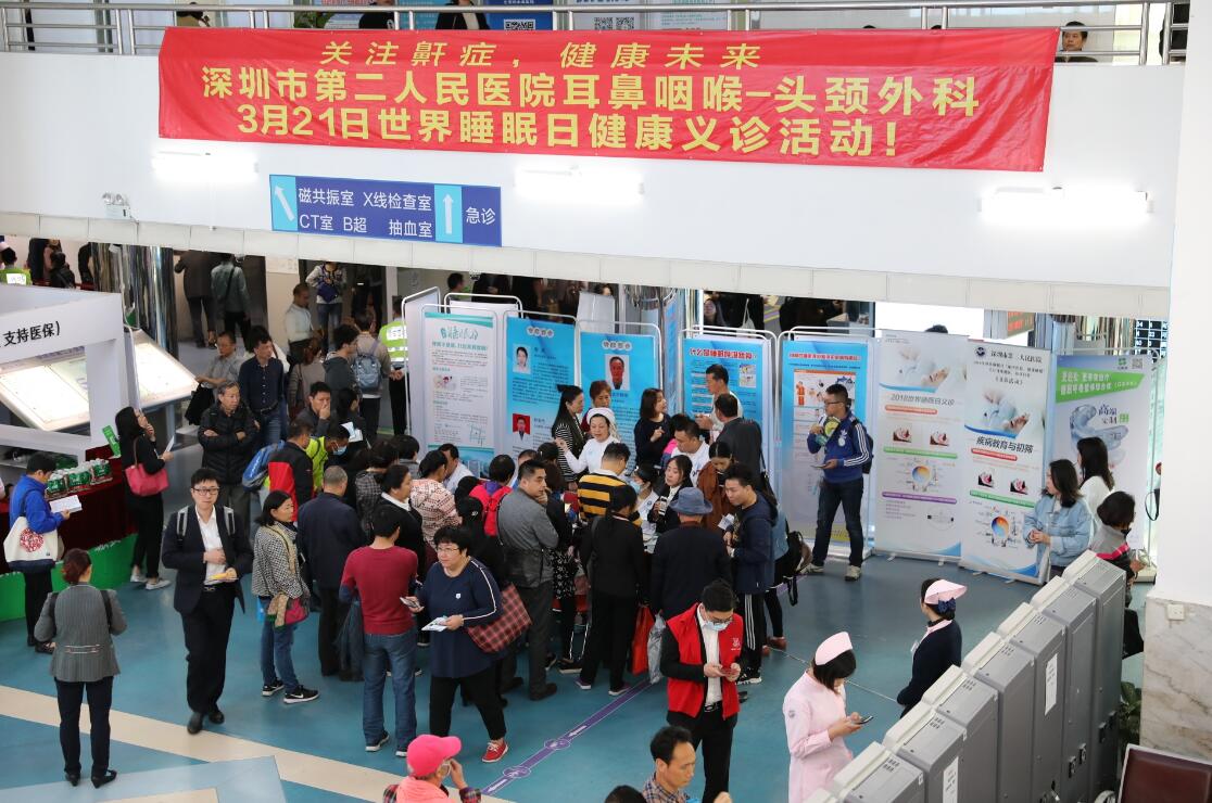 “世界睡眠日”当天,深圳市第二人民医院耳鼻喉科在门诊一楼举办大型义诊活动,由深圳市第二人民医院耳鼻喉科副主任苗北平、副主任医师陶晶、以及孙金杰博士主诊。为前来就诊的睡眠障碍者提供免费问诊,测评ESS嗜睡量表,免费进行阻塞性呼吸暂停低通气综合征(OSAHS)风险评估,现场预约睡眠监测检查,并发放睡眠健康知识宣传手册等。此次义诊接诊患者200余人,登记预约睡眠监测检查约100余人。