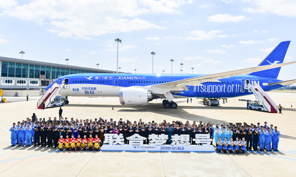 据了解,2017年2月15日,厦航与联合国在纽约签署协议,成为全球首家与联合国开展可持续发展目标合作的航空公司。这架“联合梦想号”飞机在美国波音工厂交付时,联合国副秘书长艾莉森·斯梅尔(Alison Smale)、中国驻美国大使崔天凯、波音中国总裁庄博润(John Bruns)等嘉宾在现场见证了这架特殊飞机的交付。(张杰)