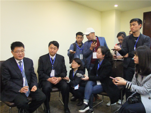 贵州省人力资源和社会保障厅副厅长施长冬(左一)接受记者采访。