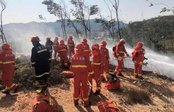 演练活动中,农林水务管理中心“互联网+”红外摄像头监控到不明热源,第一时间通知森林消防中队前往核查,并确认发生森林火灾。根据火场情况,启动《大鹏办事处处置森林火灾事故应急预案》Ⅳ级响应,各成员单位快速反应,第一时间到达,并按照现场指挥安排进行救援。