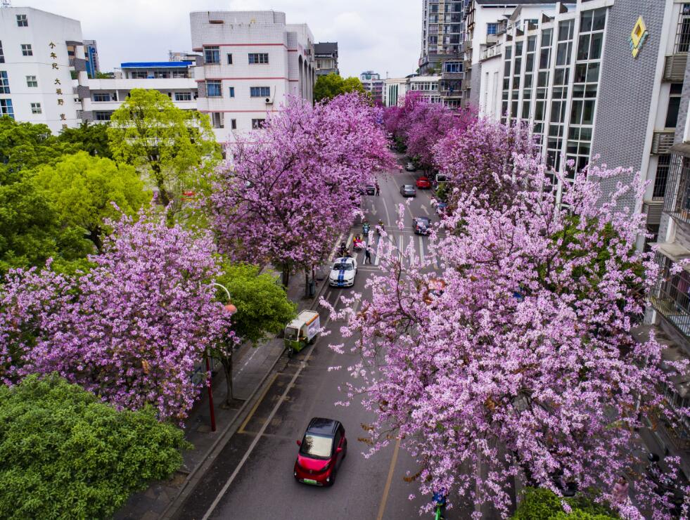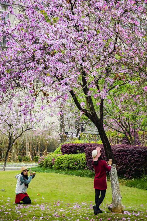 【香港商报网讯】记者唐琳报道:近日,广西柳州栽种的24万株洋紫荆进入花期,粉色的花瓣盛开在城市的大街小巷,引各地游人前来拍照,不少游客表示,随便截取一个镜头就是“大片”!