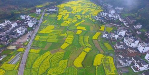 油菜花与粉墙黛瓦的徽派民居交相辉映。(中新网)
