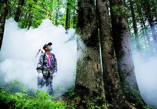 图为:专业技术人员正在林间开展病虫害防治。
