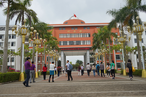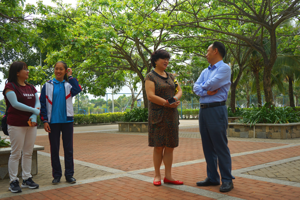 学校绿树成荫。图为中宣部对外新闻局詹安玲处长与万宁市委常委、宣传部部长杨志斌亲切交谈