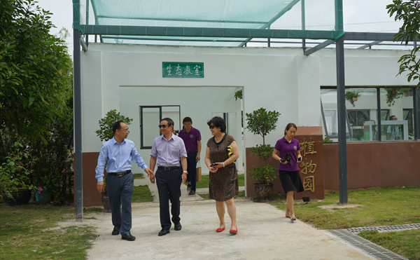 学校植物园里的生态教室。从左到右为万宁市委常委、宣传部部长杨志斌、学校张东海校长及中宣部对外新闻局詹安玲处长亲切交谈
