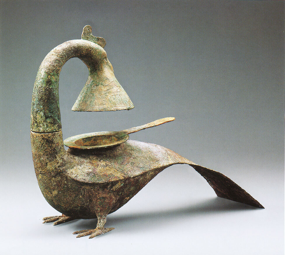 圖為合浦出土的西漢銅鳳燈造型優美,工藝精良,是古代青銅器的珍品。