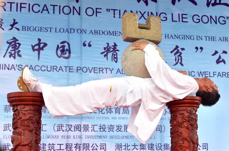 “天星卧功”(躯干悬空下腹部承重最大)世界纪录认证活动3月31日在武汉蔡甸花博汇景区上演,蔡甸“天星卧功”创始人蔡明勇躯干悬空下腹部承重180斤,创世界记录。