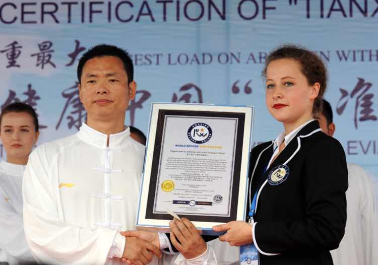 经世界纪录认证机构(WRCA)确认:中国湖北省武汉市蔡明勇,男,42岁。于2018年3月31日,在中国湖北省武汉蔡甸大集花博汇的世界纪录认证官方现场挑战中,躯干悬空下腹部承重180斤,停留十秒以上,被认定为“躯干悬空下腹部承重最大”世界纪录。