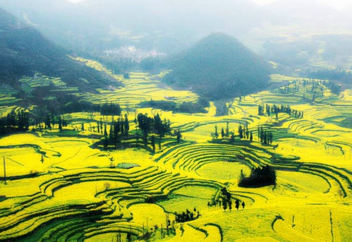 罗平油菜花是指罗平县一种美丽而蔚为壮观的人造景观。每年春节后,成千上万游人从四面八方来到罗平观花海,弄花潮,寻花思情。罗平是我国的油菜生产基地县,也是蜜蜂春繁和蜂产品加工基地。每年2、3月份,20万亩油菜花在罗平坝子竞相争放,放眼望去,是一片一望无际的金黄,让人无不感叹罗平是“金玉满堂”之乡。