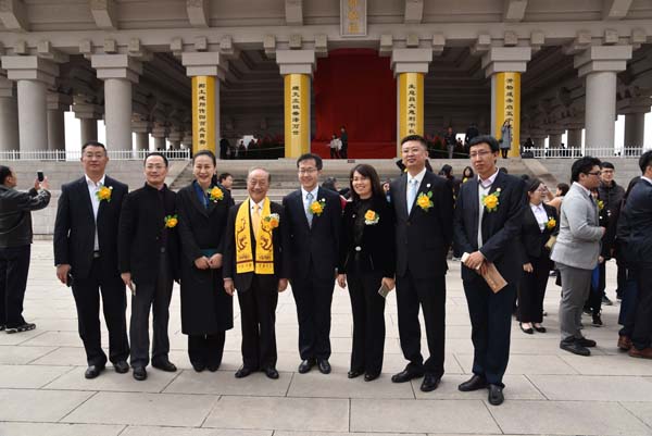 新党主席郁慕明(左四)与参祭代表在黄帝陵轩辕殿前合影留念