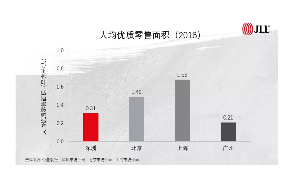 相较于北京和上海,深圳的优质零售资源相对稀缺,尤其缺乏知名开发商运营的项目。截至2016年底,深圳人均优质零售物业面积仅为0.31平方米,与北京和上海仍有一定差距,且市区与市郊供应分布极为不均。