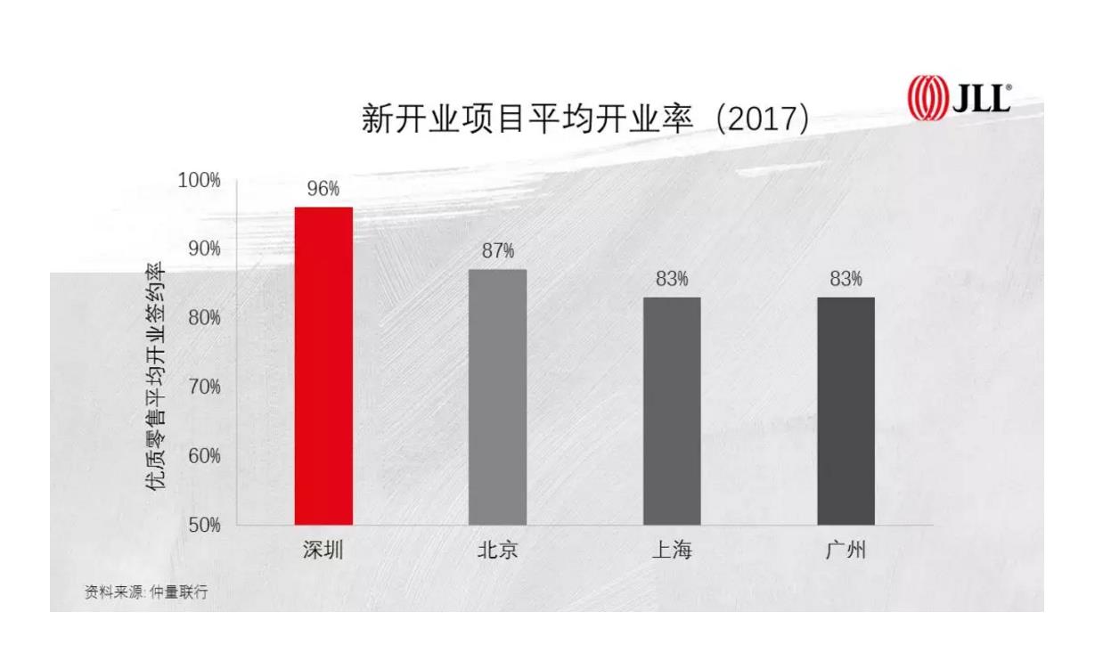 【香港商报网讯】记者王晓蕾报道:纵观2017年全年,深圳新开业购物中心表现不失为惊艳,在新增供应达历史峰值——超90万方的情况下,新项目平均开业签约率达96%,远高于其他三个一线城市。其中位于宝安的壹方城,以36万方的超大体量开业即实现满租,且首日客流量超40万人次。记者昨日从仲量联行获悉,深圳优质零售物业在2017年能有如此亮眼的表现,归根结底是由于优质零售项目品质的提升以及日益增长的消费需求。仲量联行华南区研究部总监曾丽表示,2018年深圳将迎来更多的购物中心开业,对于深圳优质零售市场持乐观预期。