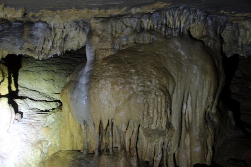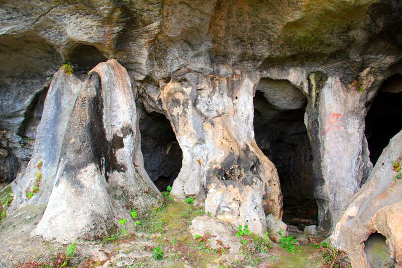 走进笫一个溶洞群,洞口高约2米,宽约0.8米,形象腰状,当地村民叫高岩洞,村民王改勇头戴矿灯带我们走进高岩溶洞,洞内很宽,形弧线状,长约60米,最深处约35米,最高处约5.5米,座东朝西,洞内有各种石柱、石凳、石笋、石莲花等石图案几十种之多,洞内蝙蝠飞来飞去,估计有几百只,往洞内深处走发现一亮点,原来该洞与大山另一边相通,我们侧身又弯腰,小心翼翼爬出高岩洞。大家长喘了一口气,稍加休息,再往东方向走了约80来米,进入了另一个群众叫鲶口岩的溶洞,鲶口岩溶洞座西朝东,面积在2000平方米以上,进入洞口,一遍阴冷,洞里有十几个小溶洞,洞洞相连、大小不一、千姿百态、鬼斧神工、稀奇罕见。