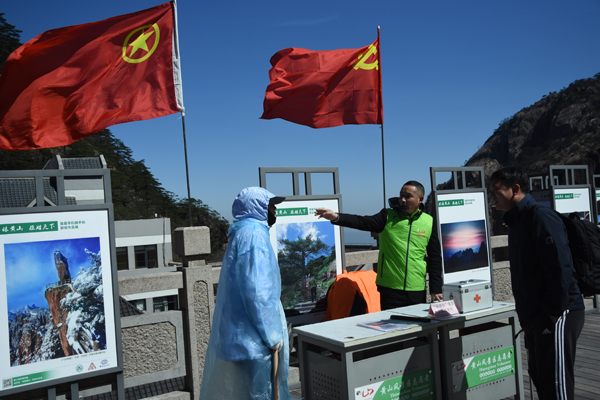4月5日,小长假首日,受雷雨天气影响,上午天都峰临时关闭,景区电子显示屏滚动播放天气预报、安全提醒和关闭通告,天都峰入口处安排人员进行解释和劝阻,并提醒游客注意安全。小长假后两天黄山春光明媚,天朗气清,虽然气温较低,但雨后花更娇,叶更绿,山更青,引得游客纷纷称赞,尽情享受着假期的恣意和闲雅。