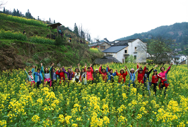 图为游客在休宁县油菜花田里合影 陈佳摄