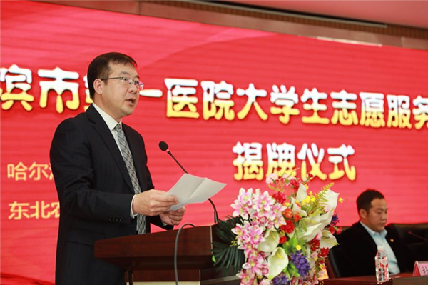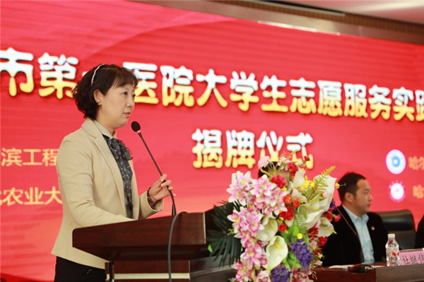 哈尔滨市第一医院副院长杜继伟在致辞中对大学生志愿服务实践基地未来的发展前景进行了展望。他表示,青年大学生是社会新技术、新思想的前沿群体,希望通过建立大学生社会实践志愿服务基地,与各学府共同携手为莘莘学子们搭建实践平台,不仅为他们提供融入社会的学习、实践机会,同时,也借助于医院这个关联千家万户健康的特殊机构,培养大学生的爱心奉献意识,树立奋发图强、报效祖国和人民的信念,使大学生们在为就医患者提供具体、细致、文明、健康的人性化服务与关怀中提升自己,让新时代的大学生在迈入社会的第一步中就能够奉献爱、感受爱、收获爱。相信此项举措对规范整合医疗服务中的公益行为,营造温馨的就医环境,构建和谐的医患关系以及对当代大学生树立正确的世界观、人生观、价值观都具有积极的社会意义。