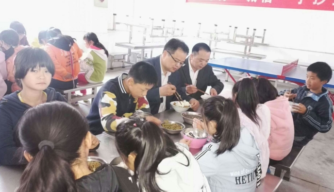 【香港商报网讯】“你们都喜欢吃什么菜?觉得学校伙食怎么样?”4月16日午餐时间,长沙县青山铺镇中心学校书记李松奇及行政人员一行,来到青山铺中心小学,与学生一起就餐,学校食堂其乐融融。