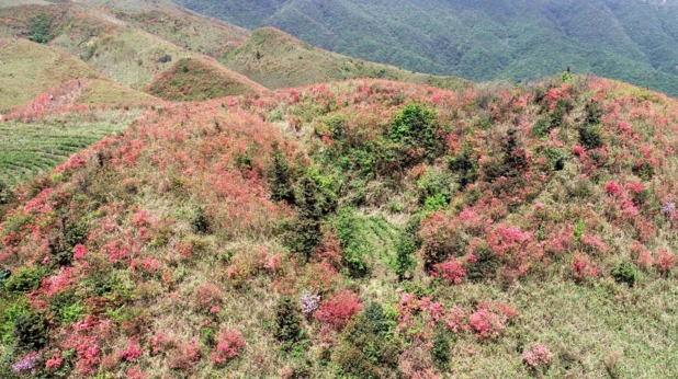 4月17日,无人机航拍的三江侗族自治县独峒镇干冲村三省坡漫山杜鹃花。