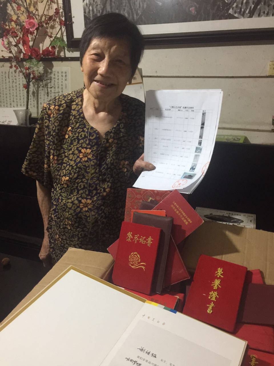 王憨山夫人谢继韫展示捐赠证书。