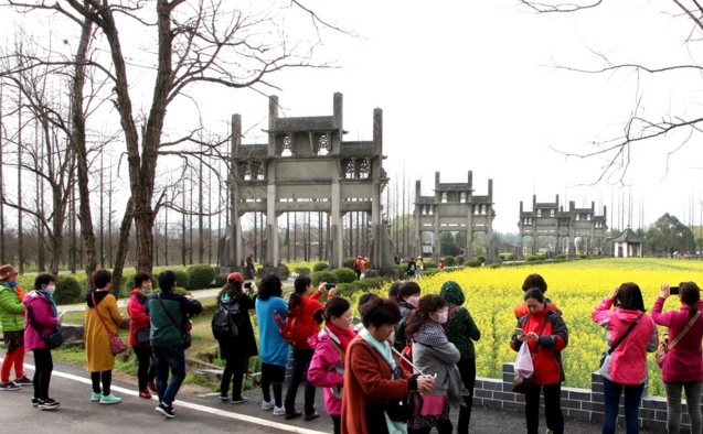 游客在歙县棠樾牌坊赏花景。吴建平摄