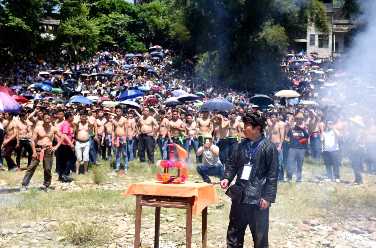 4月18日,人们在三江侗族自治县富禄苗族乡都柳江河畔抢花炮。