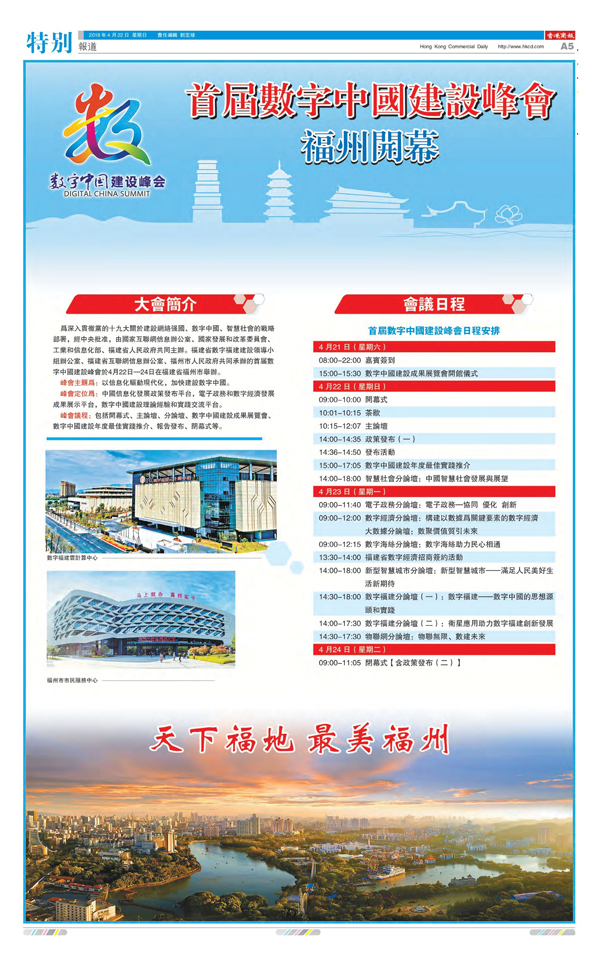 为深入贯彻党的十九大关于建设网络强国、数字中国、智慧社会的战略部署,经中央批准,由国家互联网信息办公室、国家发展和改革委员会、工业和信息化部、福建省人民政府共同主办,福建省数字福建建设领导小组办公室、福建省互联网信息办公室、福州市人民政府共同承办的首届数字中国建设峰会于4月22日~24日在福建省福州市举办。