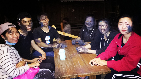 当天晚上,寨子的大街小巷到处是要乌米饭的人,不论认识与否,只要走在河边、街巷,看见人就抹锅烟灰,整个寨子像沸腾般,全寨男女老少、商家、游客都处于极度的狂欢中。