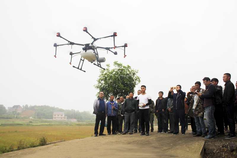 “嗡嗡嗡”,一架八桨的低空遥控无人机慢慢升空,引得众人纷纷围观。正在演示的是湖南斯凯智城通航科技有限公司研发的植保无人机,机身配有容量约10L的药桶与8个喷洒头,操作员可通过遥控器控制无人机飞行,还可以随时一键打开喷洒开关,药桶内装的药水可通过喷头均匀地喷在植物上,每天喷洒面积可达250—300亩。区农业机械管理局工作人员表示,现在村民购买植保无人机政府还有两次补贴,无人机落地价只要3万元左右。