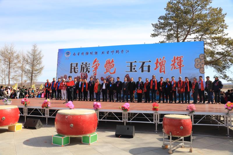傳統的薩滿祭江祈福活動後,呼瑪開江主題文化周開幕式在繽紛的焰火和喧天的鼓樂聲中隆重舉行。據了解,此次活動從4月28日持續至5月4日,以迎慶鄂倫春族下山定居65周年為契機,以全省第二屆觀賞石大賽為載體,以落實習近平總書記“冰天雪地也是金山銀山”重要論述為主線。