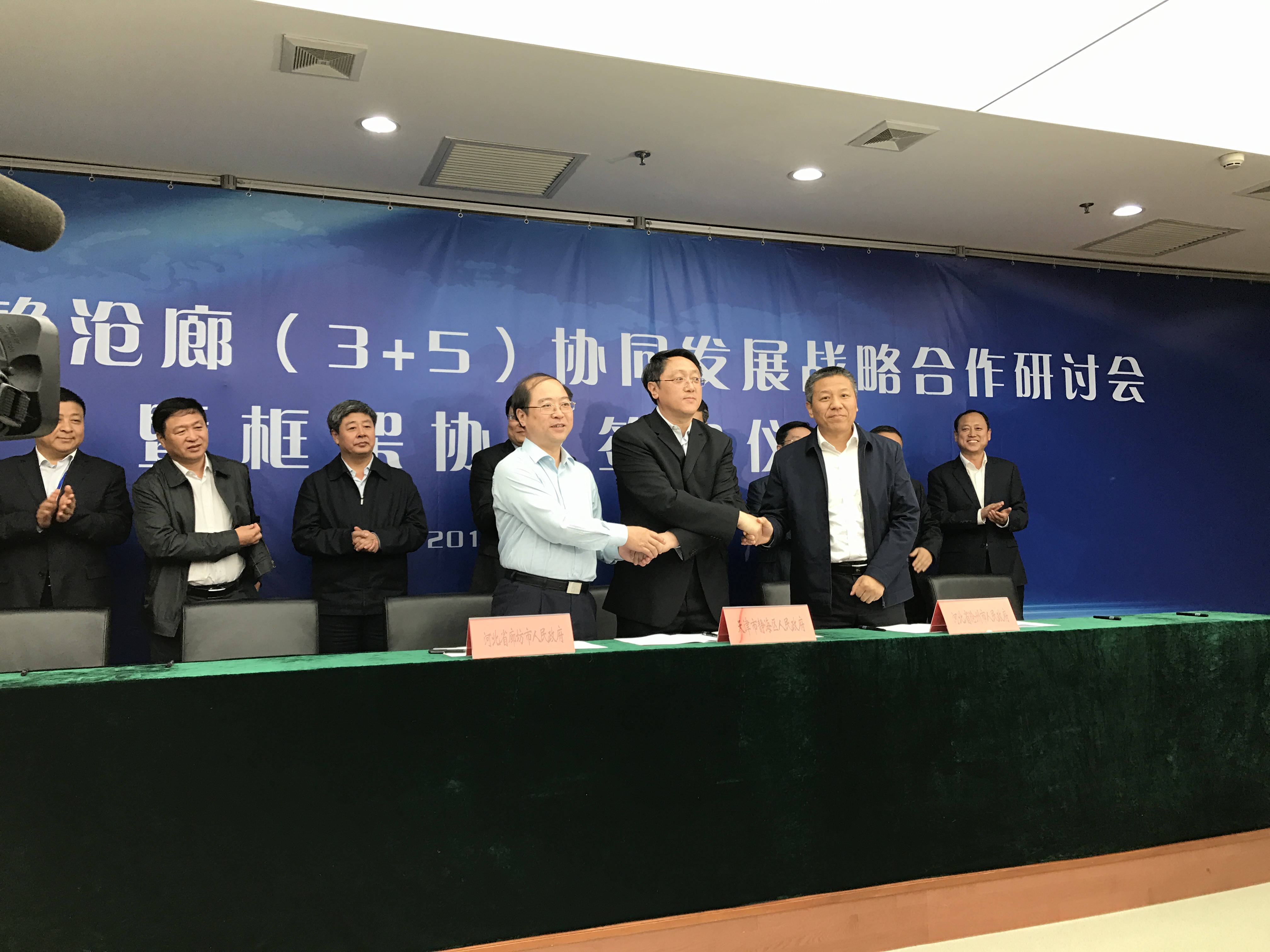 之後,靜海、滄州、廊坊三地舉行了深化靜滄廊“3+5”協同發展戰略合作框架協議簽約儀式。儀式上,在天津市政府領導同志、天津市京津冀協同發展領導小組辦公室相關領導同志與靜海區、河北省各市縣主要領導同志的共同見證下,三地共同簽署了《關於深化靜滄廊(3+5)協同發展戰略合作框架協議》《津冀“1+5”交通協同發展戰略合作框架協議》《水務專項合作協議》。