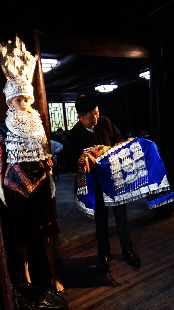麻料村百匠银器农民专业合作社副董事长李仕宁展示刚刚完成的苗族盛装