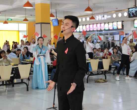 中午12时许,正逢学生用餐高峰期,随着《声律启蒙》的音乐响起,6名学生和舞蹈演员从学生餐饮文化中心的不同方向走来,演唱起《山居秋暝》《鹊桥仙》《明日歌》《墨梅》等中央电视台《经典咏流传》栏目中一首首耳熟能详的古典诗词歌曲。青春活力的表演让现场瞬间一片沸腾,正在食堂用餐的很多同学都被这热闹的气氛所感染,在“快闪”中一起感受中国古典诗词之美。