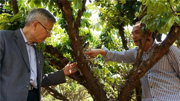 中国工程院院士尹伟伦(左)在干邦亚庄园考察石斛种源库