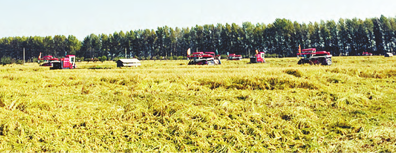2016年9月19日,在2016吉林大米高峰论坛暨“神农稻”开镰仪式上,吉林市东福米业公司百余台收割机开始收割